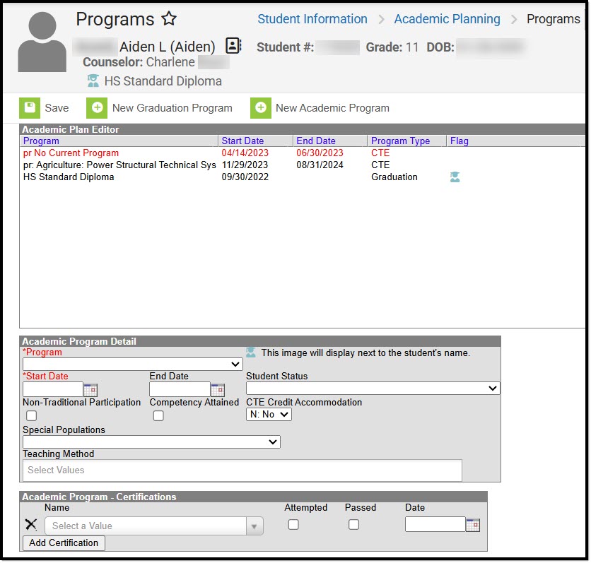 The Programs tool lists the Graduation Program and Academic Programs (if available in your state) for the selected student.