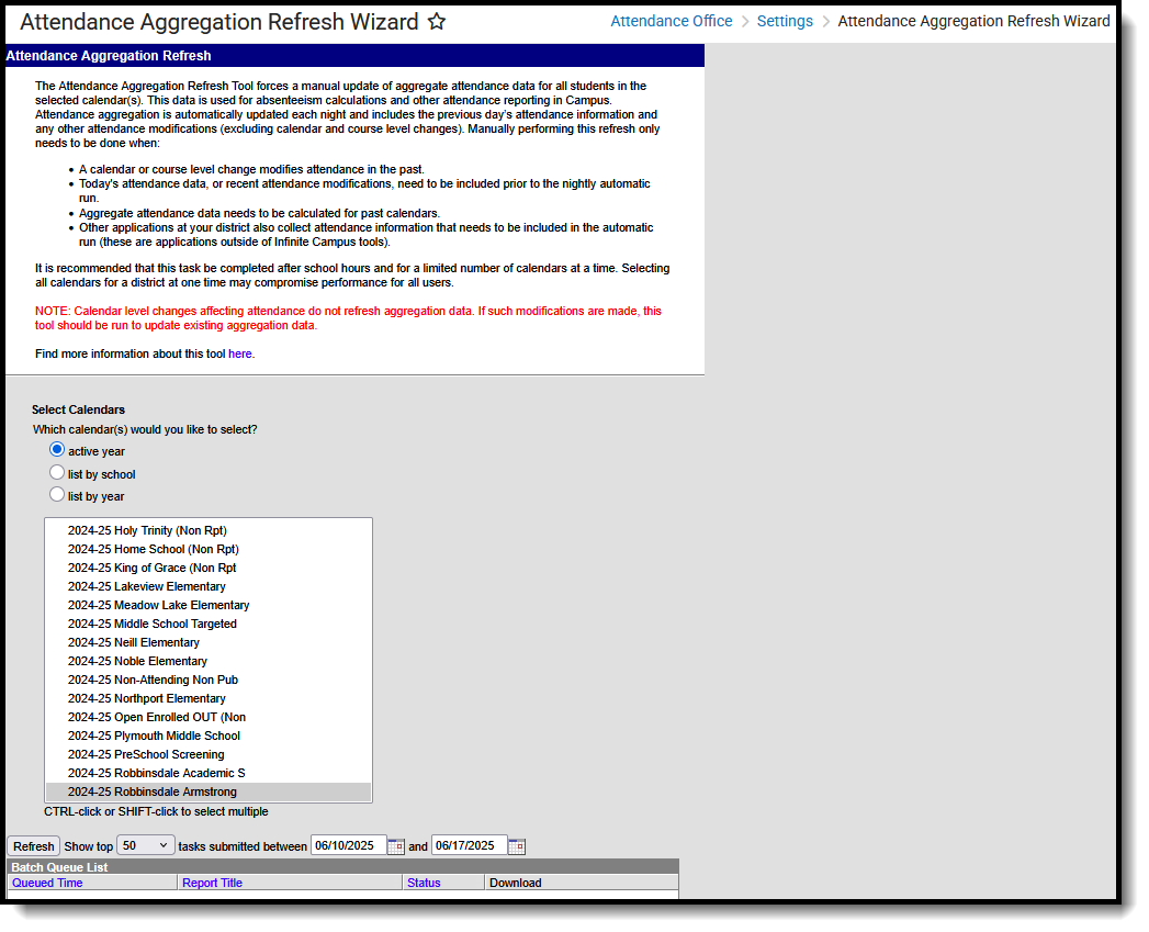 This tool sets the stored procedure and attendance views used in the chronic absenteeism calculation for the entire district. Once set, those preferences are included in the nightly quartz job.