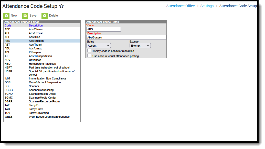 The Attendance Codes are used to create the attendance codes that are assigned to student attendance entries.These codes need to be assigned to a school calendar.