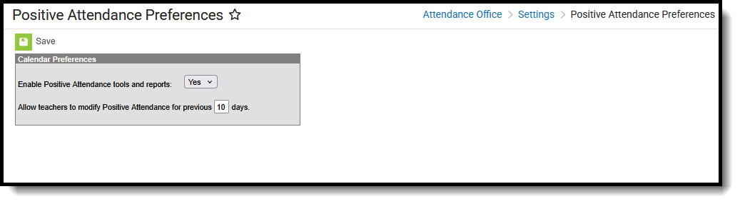 The Positive Attendance Preferences determine how a specific calendar records positive attendance for students. Positive Attendance is available per calendar, meaning in order for this editor to display, a School must be selected in the Campus toolbar. Preferences must be turned on in order to see related Positive Attendance tools.