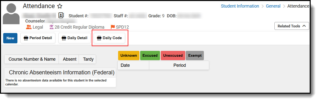 Click the Daily Code button on the student's Attendance tab to view the Daily Attendance report in PDF format. The report includes attendance events from the the active calendar that occurred prior to the current instructional day.