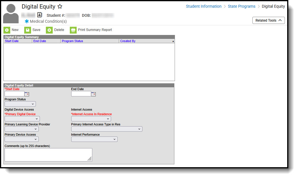 The Digital Equity tool allows schools to track digital devices and internet availability for students. More than one record can be added, but records cannot overlap.