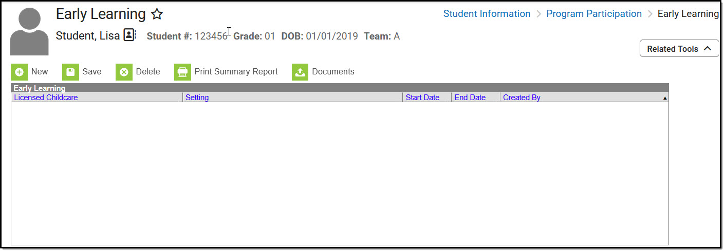 - Click the Save icon when finished. The record displays in the Early Learning window.