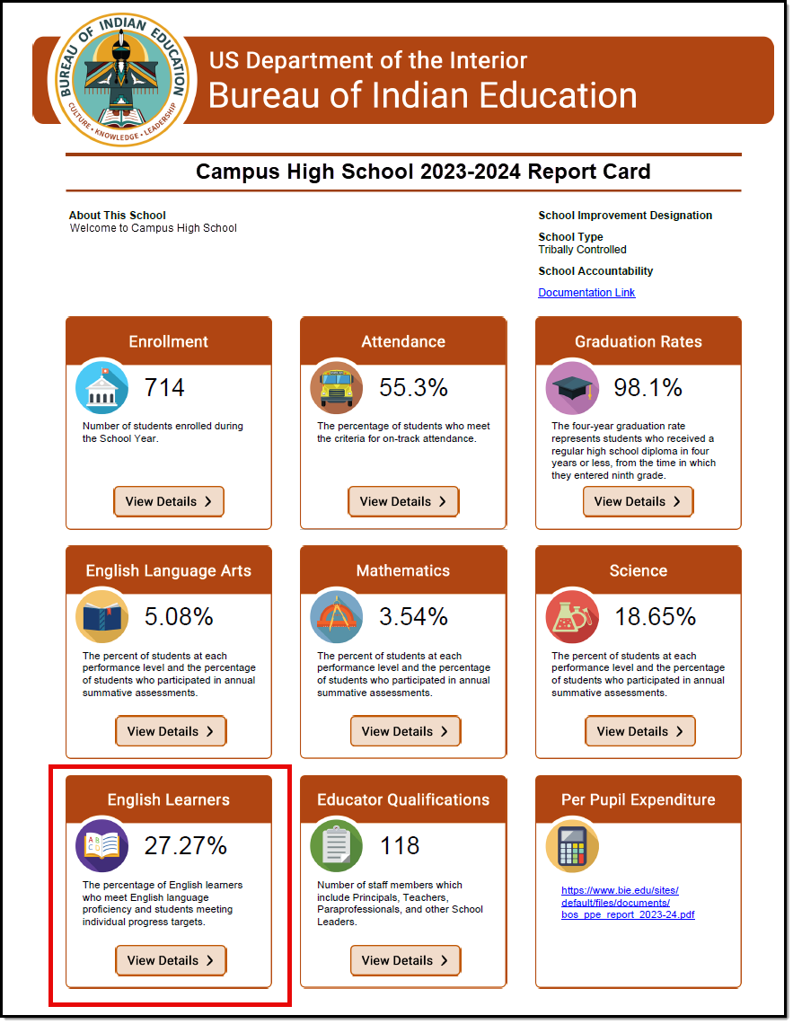 English Learners-BIE Consolidated Report Card Summary page
