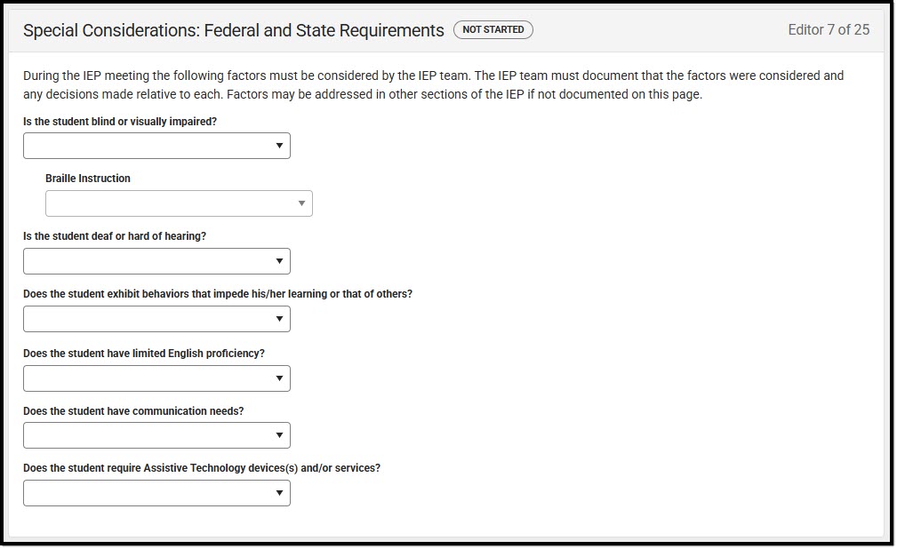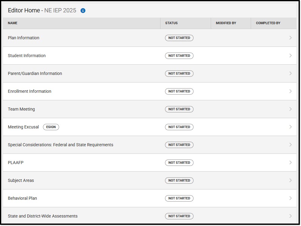 The Individual Education Plan captures student special education plan information and matches the required documentation provided by the state of Nebraska. This document describes each editor, each field on the editor, and any special considerations and instructions.