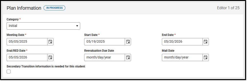 This editor is only available when the Secondary Transition information is needed for this student checkbox on the Plan Information editor is marked. When unmarked, this editor is automatically placed in a Not Needed status.