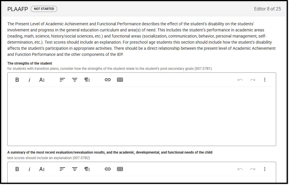 The Private School Plan is an exact copy of the Individual Education Plan. For information on general functionality, navigation, and additional plan and evaluation features, see the core Plan and Evaluation Information article.