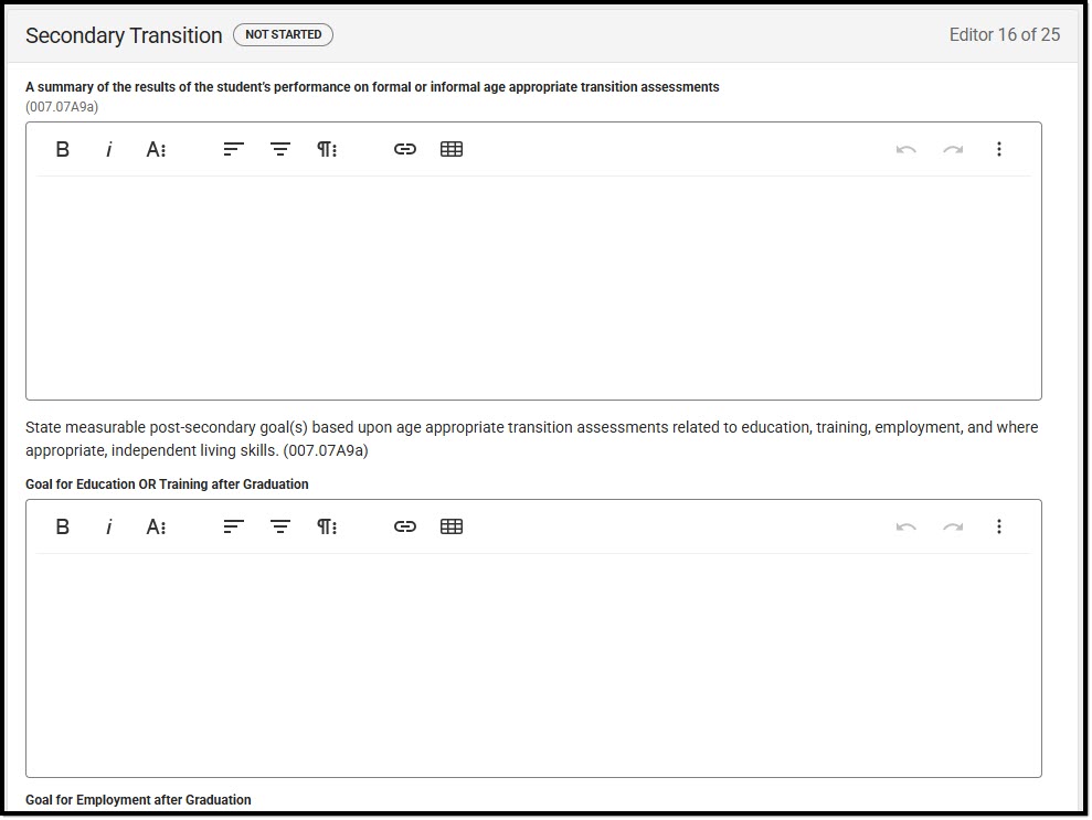 The Secondary Transition editor documents the student's post-high school goals and the transition services that will be provided to aid them in achieving them.