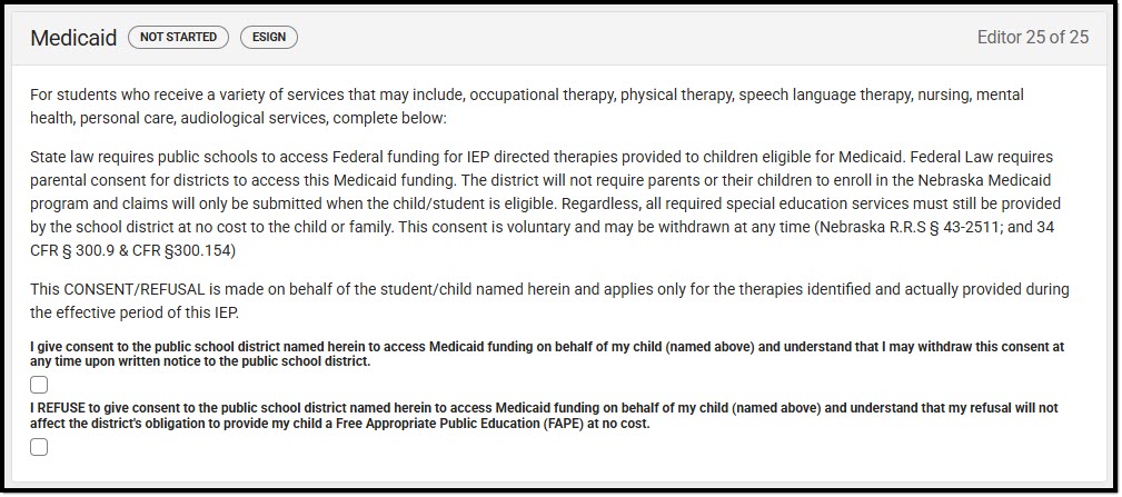 The Medicaid Consent editor documents the parent/guardian's consent for the district to disclose the student's information regarding seeking Medicaid funding. Users can either mark the consent or refusal checkboxes, but not both.