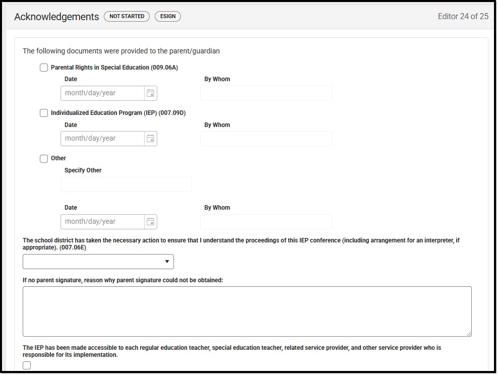 This editor is often filled out and electronically signed by the student's parent/guardian. In order to send the plan for eSignature, this editor must be placed in the status Complete Pending eSignature. See the Nebraska Special Ed Plan eSignature Process article for additional information.