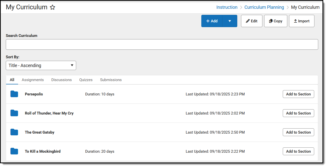 A new tool called My Curriculum has been added to Instruction. This tool allows teachers to create folders, assignments, and resources outside of the context of a section. Teachers can build out curriculum, with content, quizzes, etc, and then add it to their sections later. From My Curriculum, teachers can add curriculum to individual or multiple sections at a time.