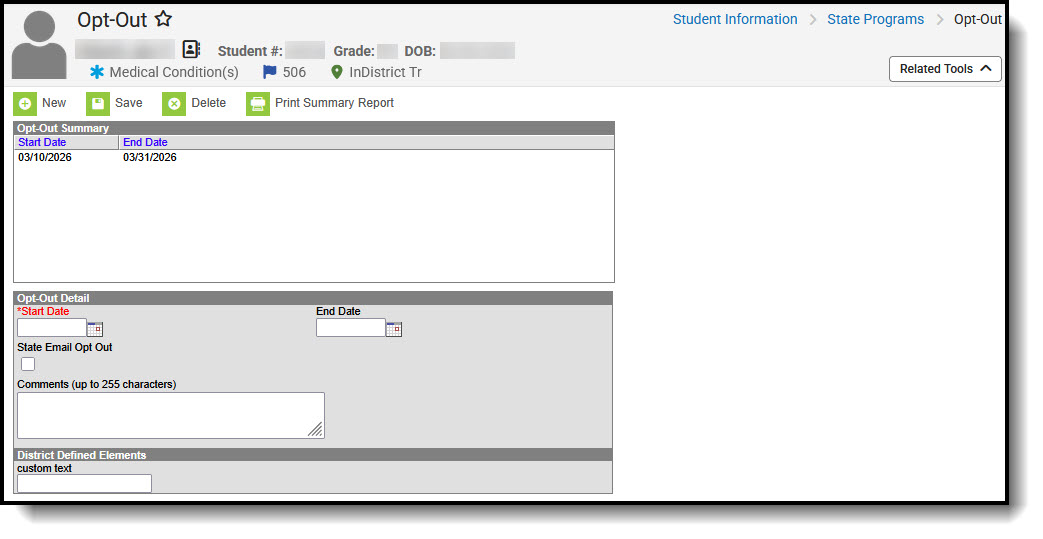 | Start Date (Required) | The start date for the record. | Database: ProgramOptOut.startDate Ad hoc Inquiries: Student > Learner > State Programs > ProgramOptOut > startDate |
