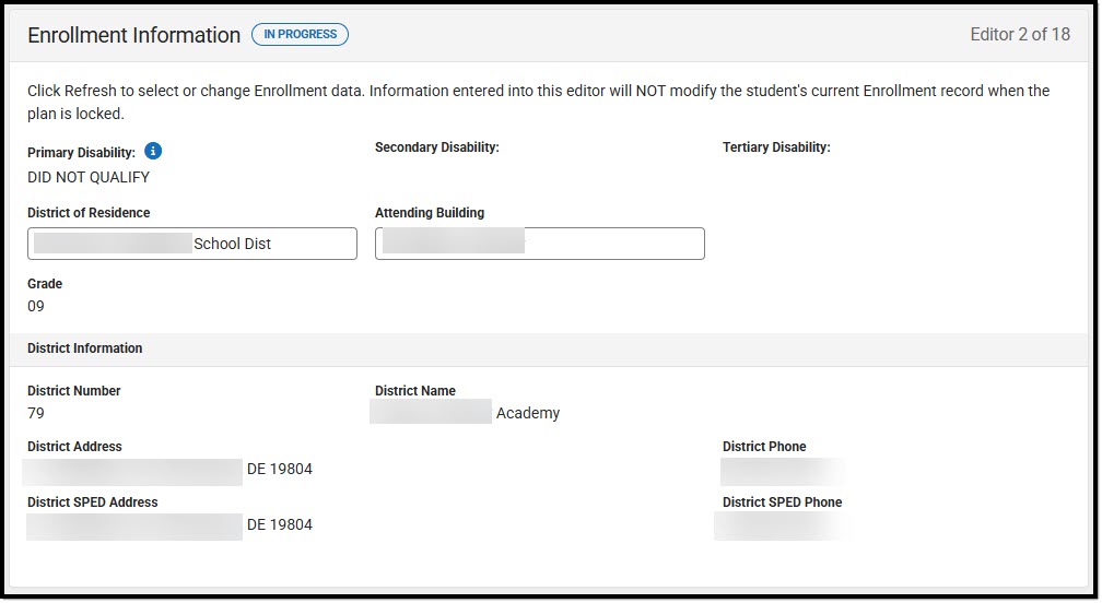 The Enrollment Information editor is a read-only editor that pulls in district and school information where the student is enrolled. This editor also documents the student's disability(ies).