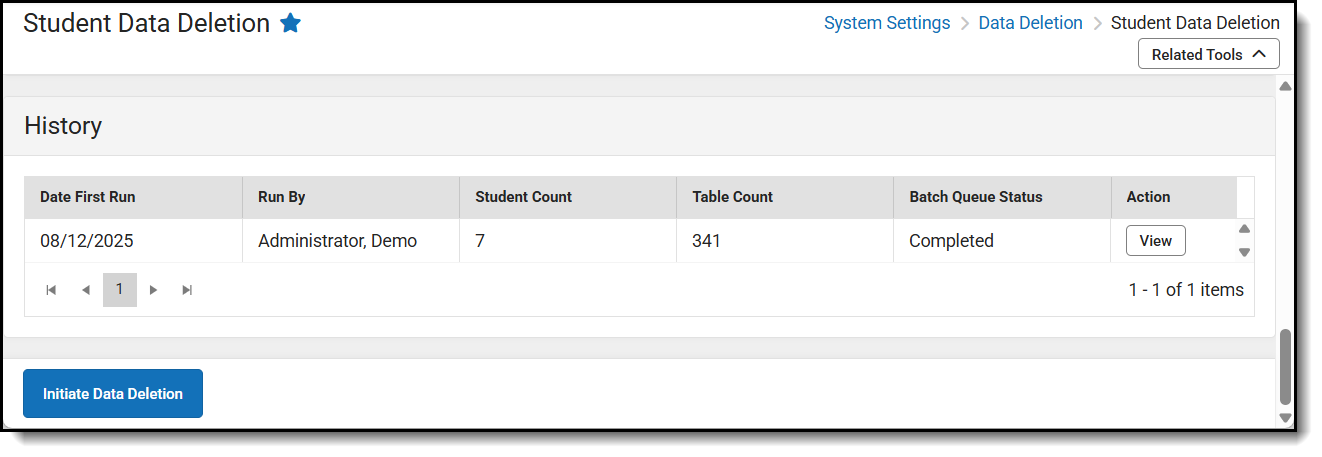 The History feature in Student Data Deletion will give summaries of each run. It includes the run date, the person who initiated the run, the students and tables involved in the deletion process, and the Batch Queue Status, which indicates the current phase of the data deletion. After clicking View in the Action column, the list of students and tables can be downloaded using their corresponding export buttons.