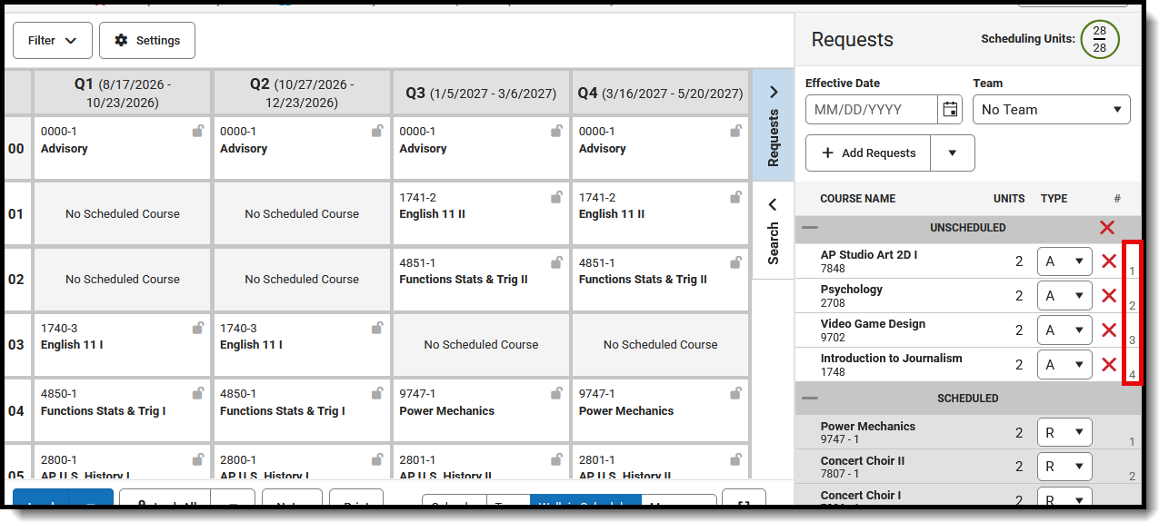 Course Requests marked as A (Alternate) are added AFTER Required (R) and Elected (E) course requests. These requests are NOT added when running a full load.