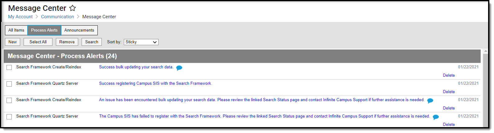 | Search Framework Index Sync | An issue has been encountered updating your search data. Please review the linked Search Status page and contact Infinite Campus Support if further assistance is needed. | One or more search framework indices are not updating. | One of the search indices will have inaccurate data. | Success updating your search data. |