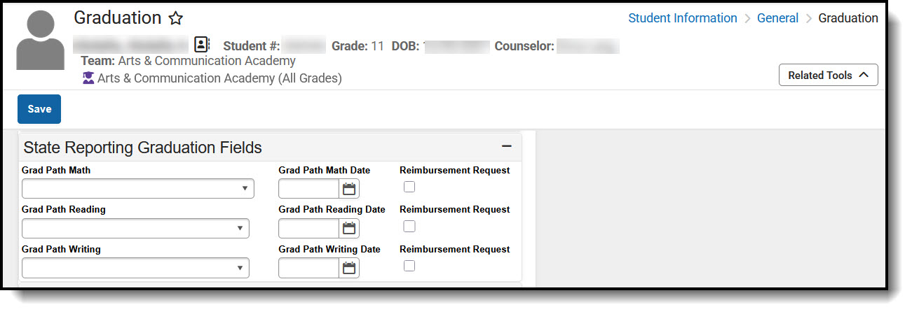 | Request Reimbursement | Allows the district to request reimbursement for the test taken. If Reimbursement Request is marked for the Grad Path Math, Grad Path Reading, or Grad Path Writing fields, reports as Y for the associated record. Otherwise reports as N. Alphanumeric, Y or N | Student Information > General > Graduation > State Reporting Graduation Fields > Reimbursement Request Graduation.gradPathMathReimburse Graduation.gradPathReadingReimburse Graduation.gradPathWritingReimburse |