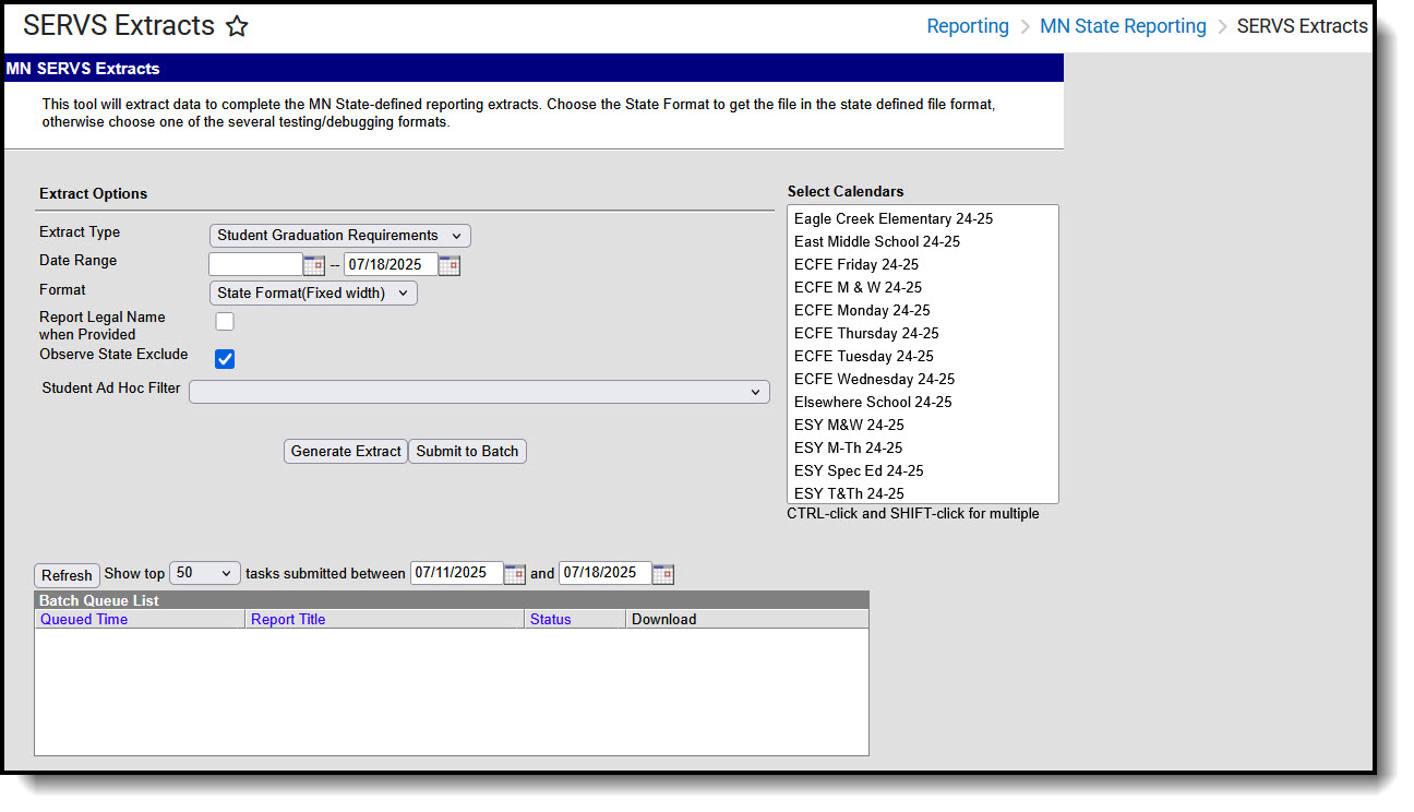 Users have the option of submitting a SERVS extract to the batch queue by clicking Submit to Batch instead of Generate Extract. This process will allow larger reports to generate in the background, without disrupting the use of Campus. For more information about submitting a report to the batch queue, see the Batch Queue article.
