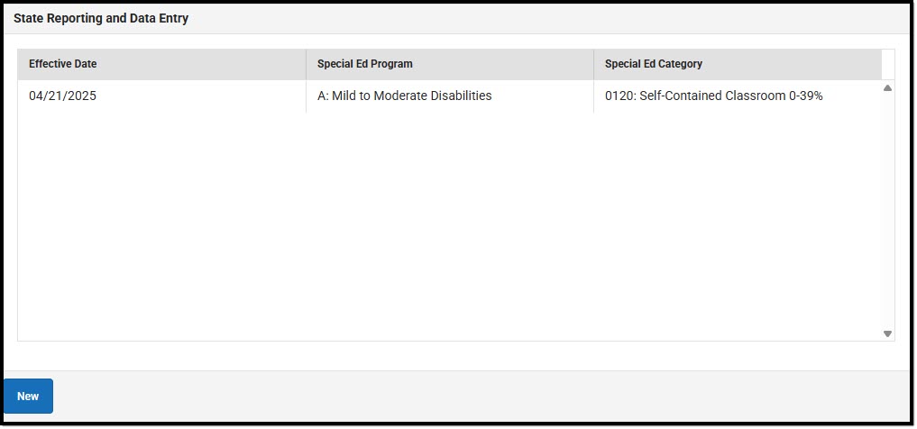 State Reporting and Data Entry List ScreenSelect an existing record or click New to open the State Reporting and Data Entry detail screen.