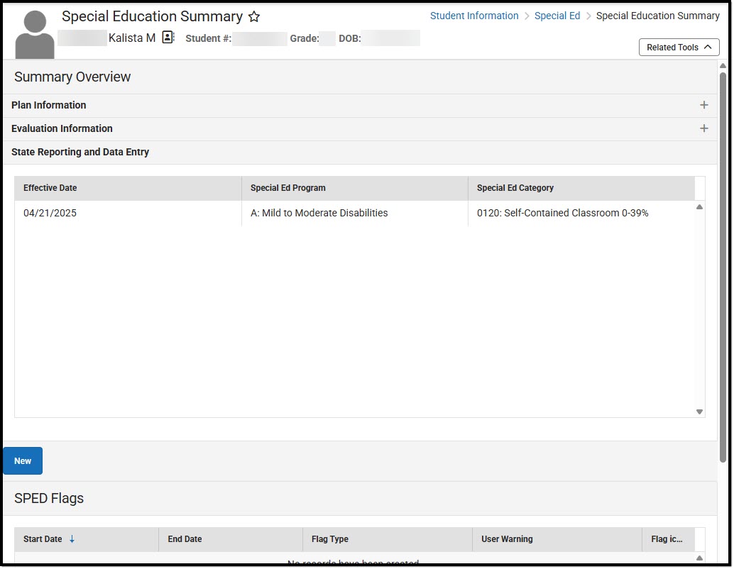 See the core SPED State Reporting article for information on necessary tool rights, SPED Flags functionality, and guidance on adding SPED State Reporting or Setting records.