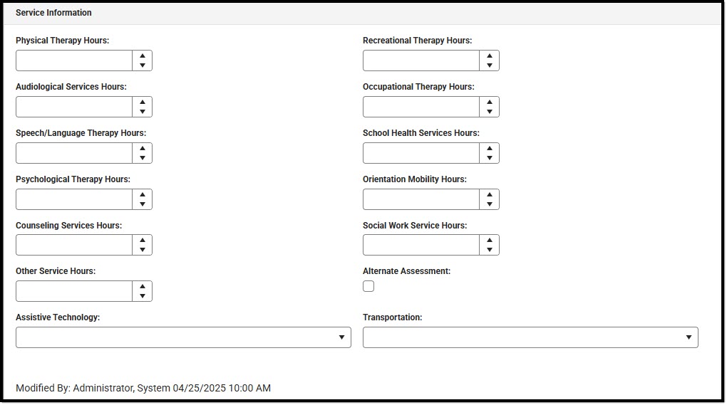 | Transportation | Indicates the student receives transportation services. | Special Ed Documents > IEP > Special Education Services > Service: Transportation |