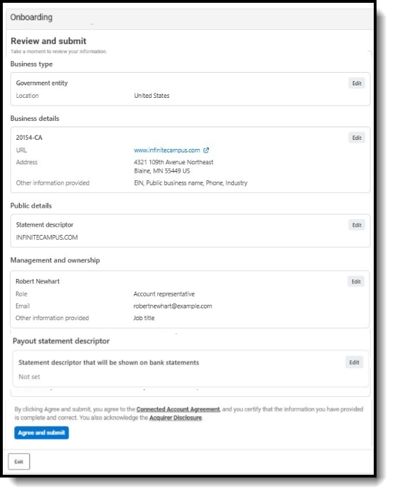 Once all sections have been completed, information entered as well as the connected account agreement and acquirer disclosure have been reviewed, the Agree and submit button must be selected.