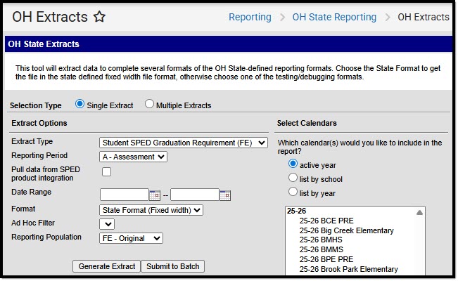 Users have the option to submit a Student SPED Graduation Requirement report request to the batch queue by clicking Submit to Batch instead of Generate Extract. This process allows larger reports to generate in the background without disrupting the use of Campus. For more information about submitting a report to the batch queue, see the Batch Queue article.