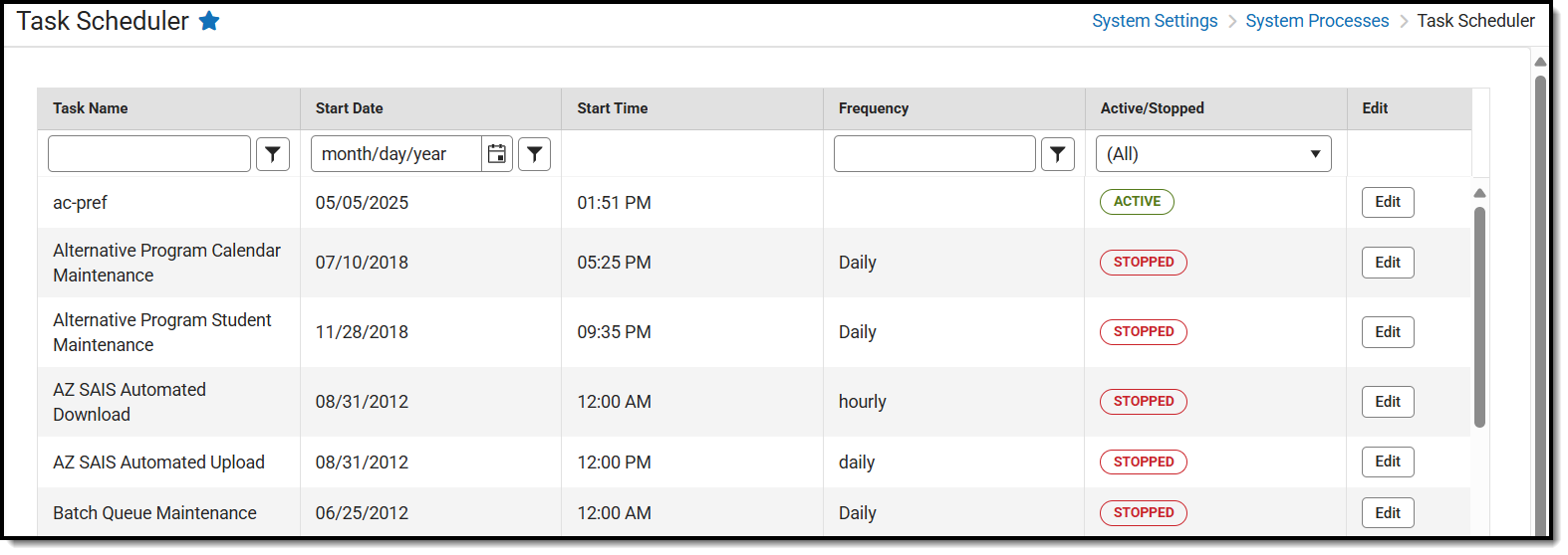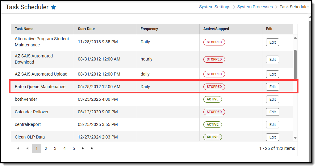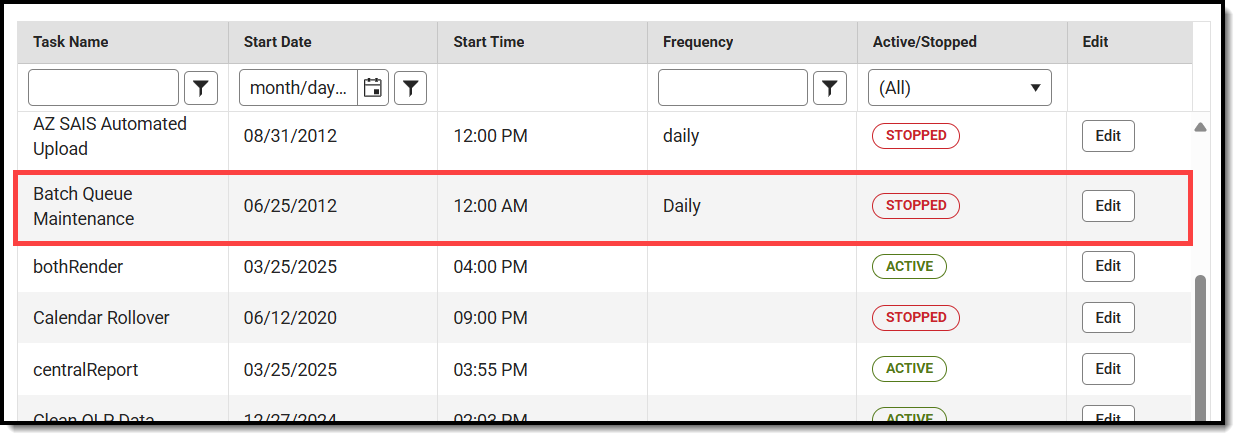 The Batch Queue Maintenance task is an automated task that deletes old reports from the Batch Queue / Admin Queue tools. If this task applies to a district or state, it will appear in the Task Scheduler.
