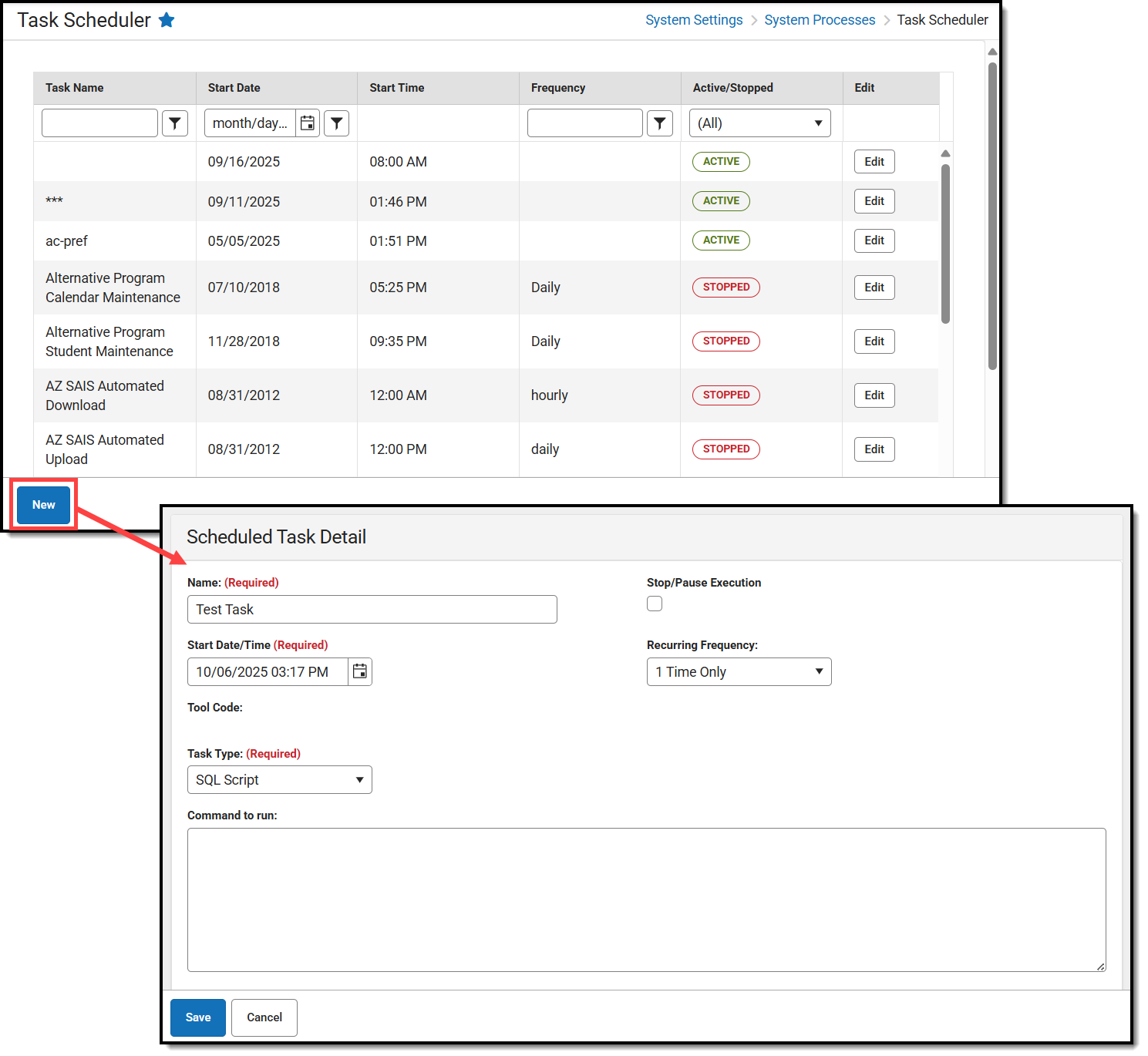 - Select the New icon from the action bar. The Scheduled Task Detail editor displays.
