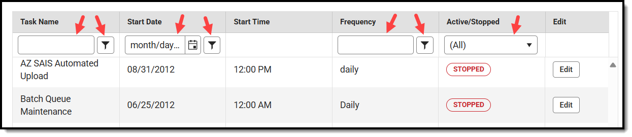 Many of the columns in the task list can be filtered and/or searched to help locate a specific task(s).