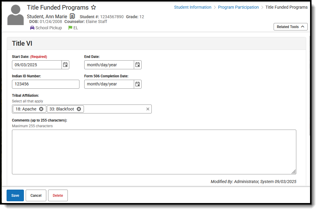| Indian ID Number | Lists the student's Indian ID number. | Database: Title6.indianIDNumber